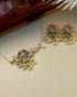 Elegant and captivating, the Kemp-stoned lotus-shaped neckpiece showcases intricate floral motifs that radiate beauty and grace. The deep, vibrant Kemp stones are delicately set, adding a pop of color and sophistication to the timeless lotus design. Its versatile style effortlessly enhances both traditional and modern outfits, making it a perfect choice for both everyday wear and special occasions.